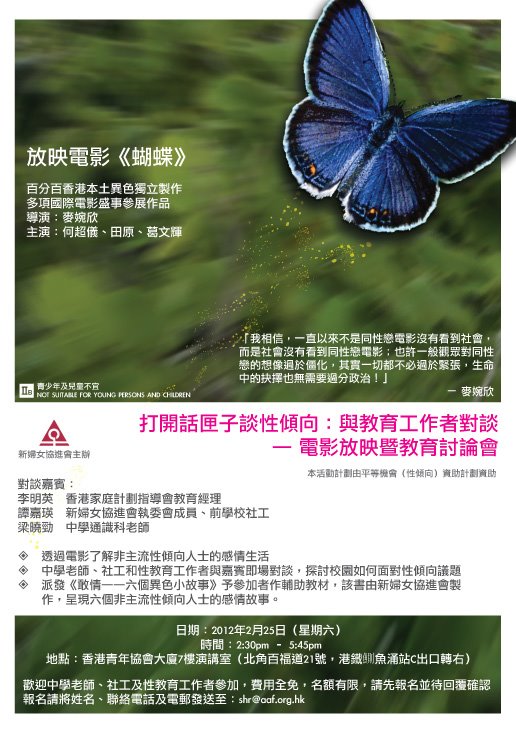 打開話匣子談性傾向:與教育工作者對談──電影放映暨教育討論會 Posted on 2012 年 02 月 26 日 in 婦進活動, 性與人權小組 打開話匣子談性傾向:與教育工作者對談──電影放映暨教育討論會 .放映電影《蝴蝶》,了解非主流性傾向人士的感情生活 .中學老師、社工和性教育工作者與嘉賓即場對談,探討校園如何面對性傾向議題 .派發《敢情──六個異色小故事》予參加者作輔助教材,該書由新婦女協進會製作,呈現六個非主流性傾向人士的感情故事。 22.290315 114.208044 Share this: Click to share on X (Opens in new window) X Click to share on Facebook (Opens in new window) Facebook Click to share on WhatsApp (Opens in new window) WhatsApp Click to share on Telegram (Opens in new window) Telegram Like Loading... Related 性/別性別平等故事