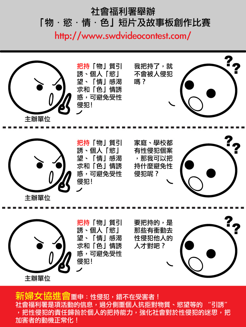 社會福利署近日舉辦一個名為『物.慾.情.色』的短片及故事板創作比賽。根據比賽網頁的資料,比賽目的是「希望透過創意短片及故事板,讓參加者探討現今青少年面對種種『物』質引誘、個人『慾』望、『情』感渴求和『色』情誘惑,如何把持,避免成為性侵犯的受害者。」