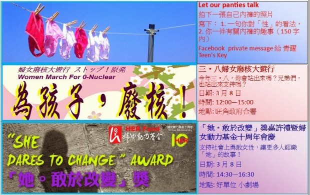 【3.8行動日曆-Women in Action!】 Posted on 2014 年 03 月 04 日 in Uncategorized 國際婦女節( International Women’s Day ) 在每年的3月8日世界各地都有不同活動慶祝女性於各個領域所作出的貢獻及成就。香港亦不例外,不同民間團體將於3月7日及3月8日期間舉辦一連串行動及活動,包括遊行集會、分享會等等,聯合各個界別的婦女,帶出不同方面的訴求,爭取女性人權、自主權等,向女性表達尊敬,從而宣揚男女平等,推廣性別觀點主流化。請踴躍參與,以爭取女性權益。 Share this: Click to share on X (Opens in new window) X Click to share on Facebook (Opens in new window) Facebook Click to share on WhatsApp (Opens in new window) WhatsApp Click to share on Telegram (Opens in new window) Telegram Like Loading... Related