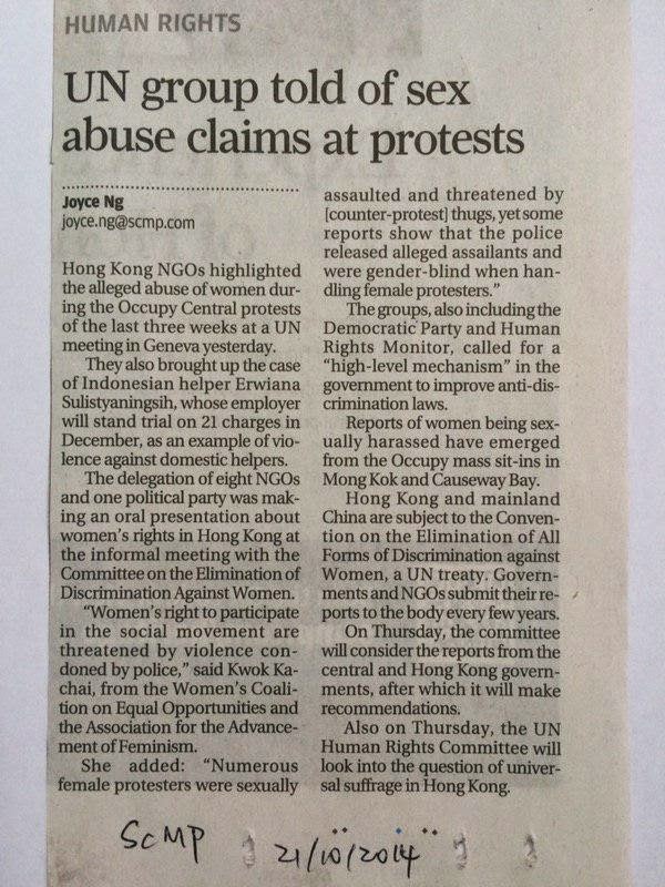 Hong Kong NGOs highlighted the alleged abuse of women during the Occupy Central protests of the last three weeks at a UN meeting in Geneva yesterday.