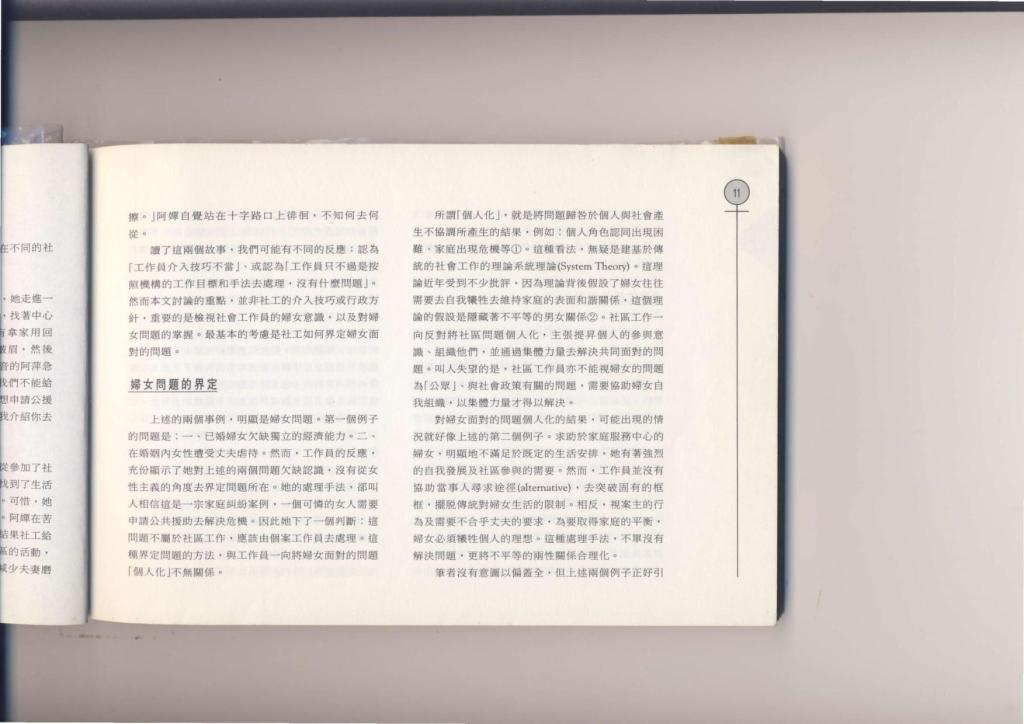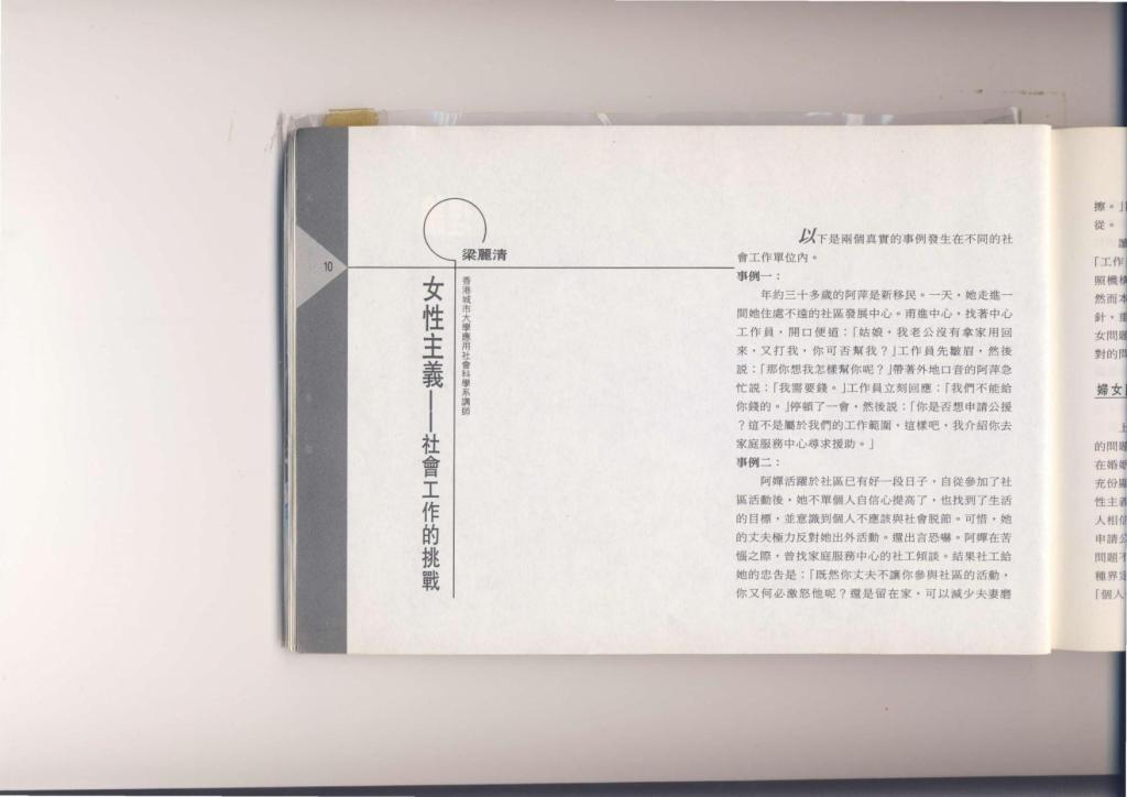 本書是一本理論和實踐兼備、深入探討本地婦女服務的書;內容分兩部分:第一部分有探討婦女服務的實踐理論,如婦女為本的服務實踐、性別的文化分析,亦有闡述本地婦女運動、婦女服務發展和婦女參政現況等。第二部分有十篇工作計劃報告,作者通過總結在不同層面的工作經驗,探討本地婦女工作面對的種種問題。