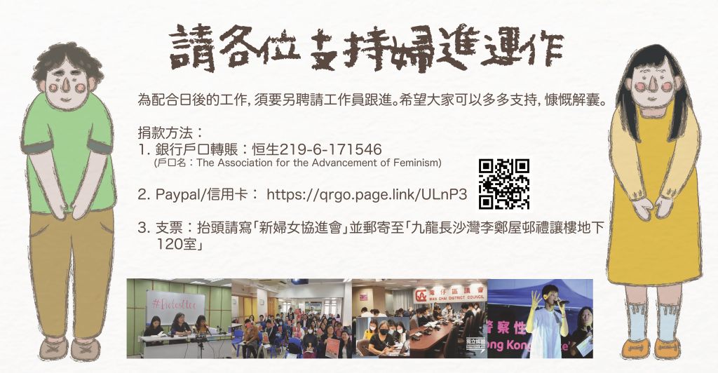 - 支票︰抬頭請寫「新婦女協進會」並郵寄至「九龍長沙灣李鄭屋邨禮讓樓地下120室」,並請註明收據抬頭及回郵地址。