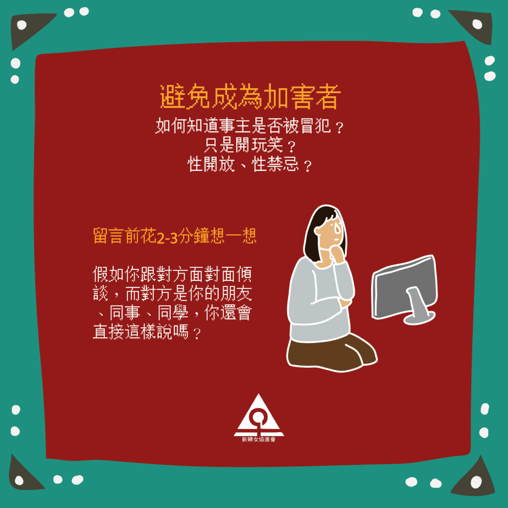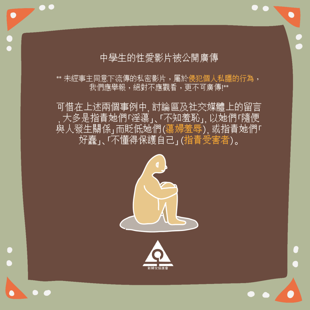另外,日前有中學生的性愛影片被公開廣傳,女事主因此受極大的情緒困擾。我們在此重申,最重要的是——未經事主同意下流傳的私密影片,屬於侵犯個人私隱的行為,我們應舉報,絕對不應觀看,更不可廣傳,否則我們亦是網上影像性暴力的加害者之一。
