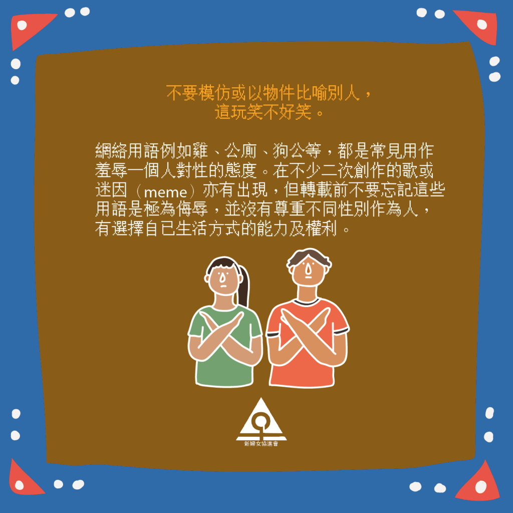 不要模仿或以物件比喻別人,這玩笑不好笑。網絡用語例如雞、公廁、狗公等,都是常見用作羞辱一個人對性的態度。在不少二次創作的歌或迷因(meme)亦有出現,但轉載前不要忘記這些用語是極為侮辱,並沒有尊重不同性別的人,也有選擇自已生活方式的能力及權利。使用這些詞語,只是突顯發言者的傲慢與無知。