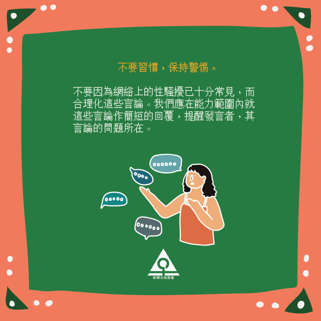 不要習慣,保持警惕。不要因為網絡上的性騷擾已十分常見,而合理化這些言論。我們應在能力範圍內就這些言論作簡短的回覆,提醒發言者,其言論的問題所在。至於是否展開漫長的討論/論戰,則看情況而定。