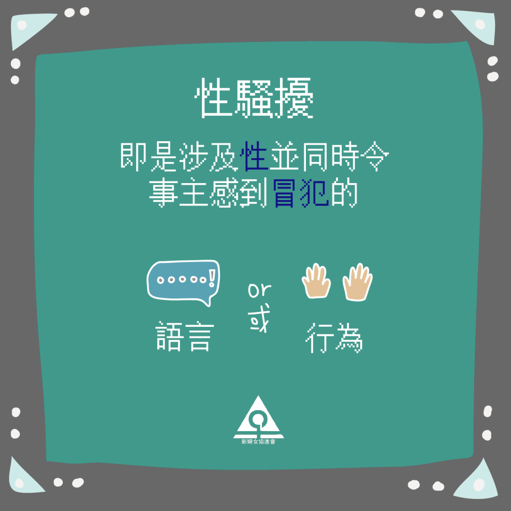性騷擾即是涉及性的言語或行為,同時令事主感到冒犯。任何性別都有可能成為性騷擾的加害者或受害者,並不限於異性中,同性之間亦有機會發生。