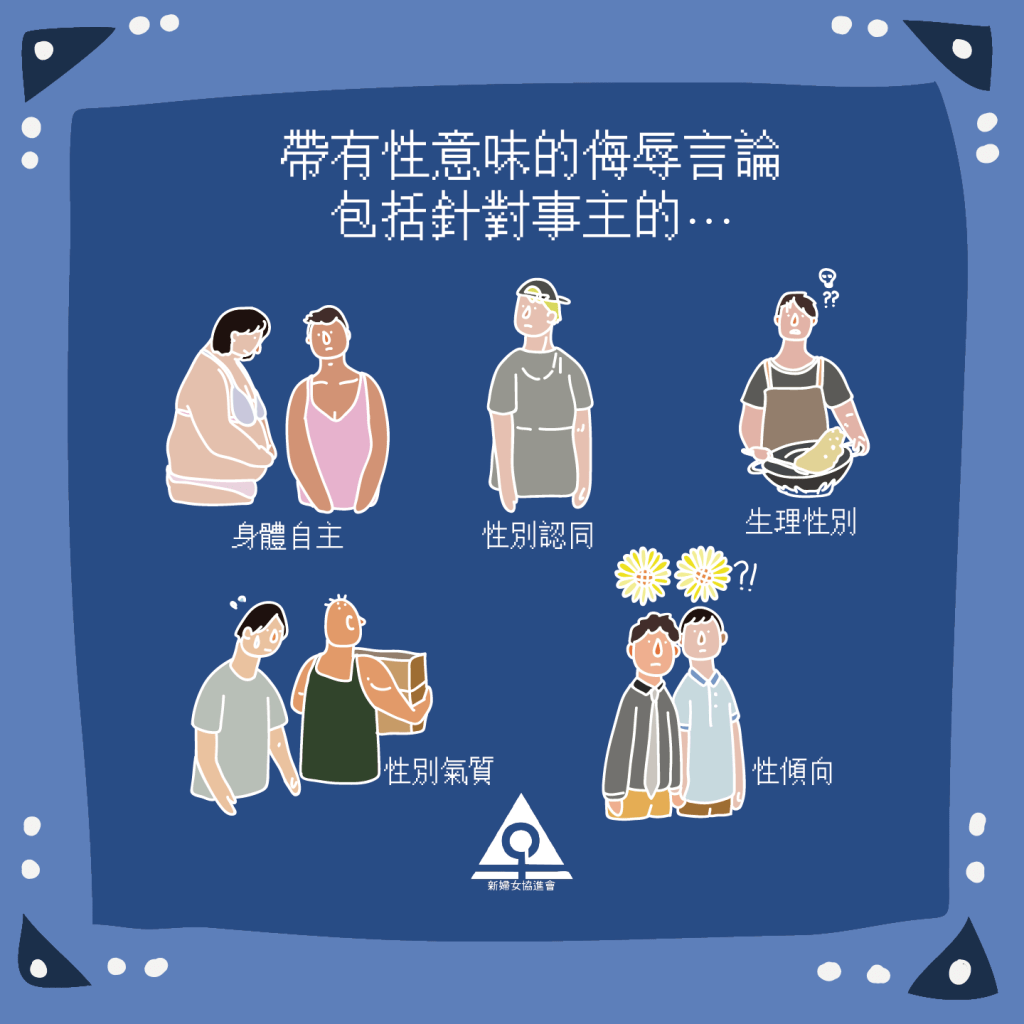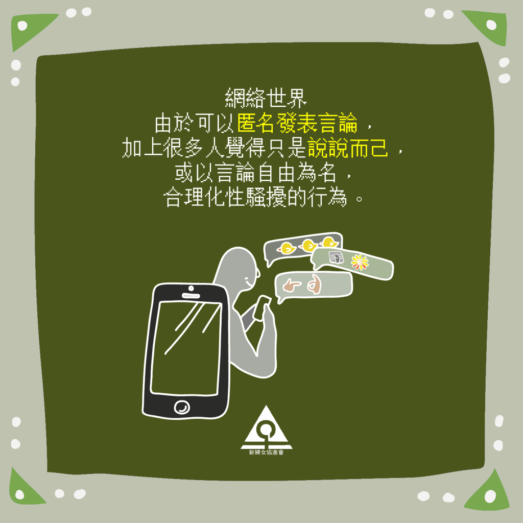 網絡世界由於可以匿名發表言論,令人以為言論難追究責任。加上,很多人忽視語言對別人帶來的傷害,往往覺得只是說說而己,或以言論自由為名,合理化性騷擾的行為,令網絡上出現愈多愈多的帶有性意味的侮辱言論。包括︰針對事主的身體自主(身形、衣著)、貶低其生理性別(男人就係會搞到個廚房爆炸)、性別認同(不男不女咁)、性傾向(菊花先生)及性別氣質(姐手姐腳咁)等等。