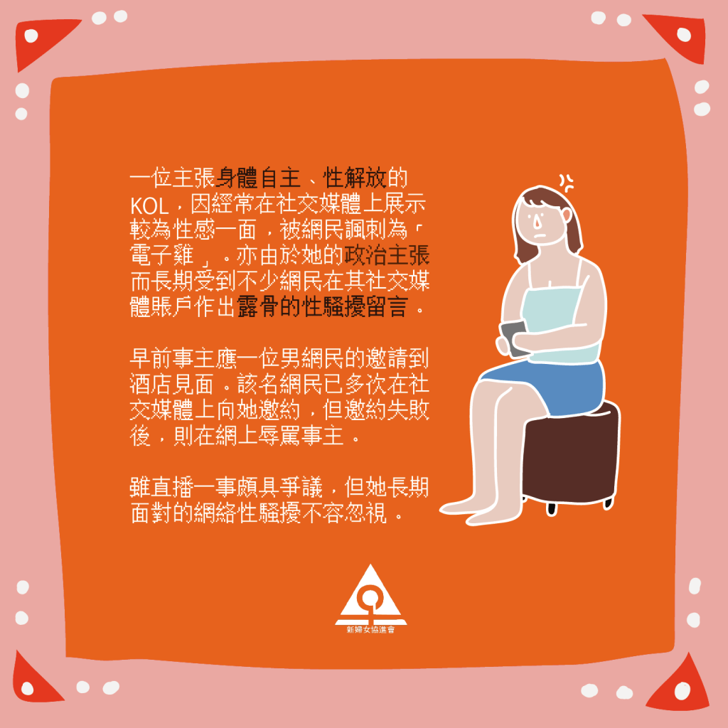 一位主張身體自主、性解放的KOL,因經常在社交媒體上展示較為性感一面,被網民諷刺為「電子雞」。亦由於她的政治主張而長期受到不少網民在其社交媒體賬戶作出露骨的性騷擾留言,部份更有威脅、恐嚇的成份。早前,事主應一位男網民的邀請,到酒店見面,該名男網民已多次在社交軟件上向她邀約,但邀約失敗後,則在社交媒體上辱罵事主。雖然,直播披露男網民個人資料的行為頗具爭議,但同時大量網民對她進行網絡性騷擾更不容忽視。