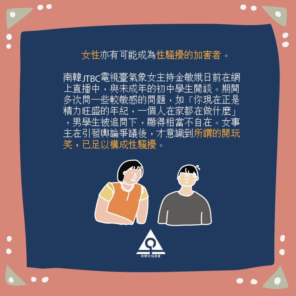 女性亦有可能成為性騷擾的加害者。根據韓聯社報導,南韓JTBC電視臺氣象女主持金敏娥日前在網上直播中,與未成年的初中學生閒談。期間多次問一些較敏感的問題,如「你現在正是精力旺盛的年紀,一個人在家都在做什麼」,男學生被追問下,顯得相當不自在。女事主在引發輿論爭議後,才意識到所謂的開玩笑,已足以構成性騷擾。