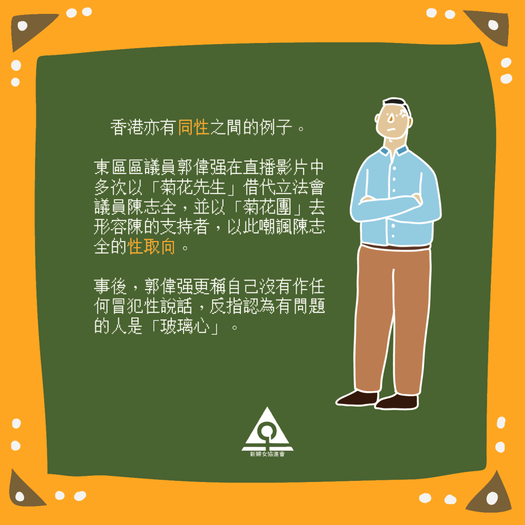 香港亦有同性之間的例子。香港東區區議員郭偉强在facebook直播影片中多次以「菊花先生」借代立法會議員陳志全,並以「菊花團」去形容陳的支持者,以此嘲諷陳志全的性取向。事後,郭偉强更稱自己沒有作任何冒犯性說話,反指認為有問題的人是「玻璃心」。