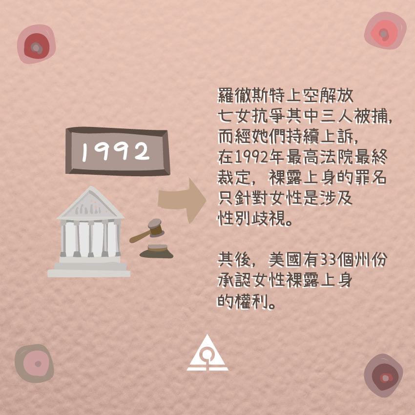 其實在1986年,美國開始有女性「上空解放」的運動,即羅徹斯特上空解放七女抗爭(Rochester Topfree Seven)。七位女性包括Ramona Santorelli,在紐約打赤膊野餐,要求男女平等、以健康的態度看待女性身體。其中三人被捕,而經她們持續上訴,在1992年最高法院最終裁定,裸露上身的罪名只針對女性是涉及性別歧視。