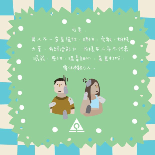 可是,男人不一定是強壯、理性、勇敢、粗枝大葉、有經濟能力,同樣女人亦不代表潺弱、感性、溫柔細心、著重打扮、要依賴別人。