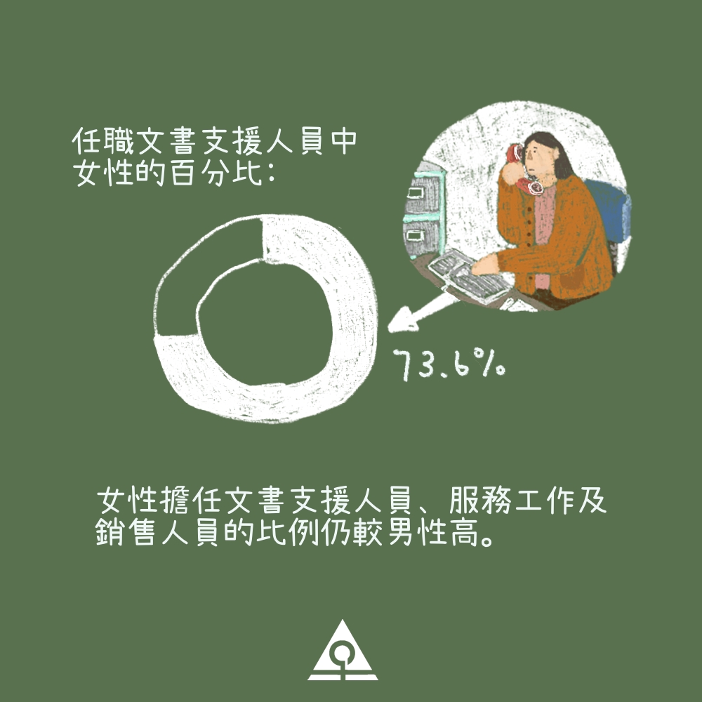 文書及服務業的基層職位仍然多由女性擔任,而經理﹑行政級人員及專業人員則主要由男性擔當,間接造成了女性收入中位數比男性為低的現象。