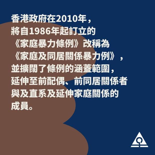 香港政府在2010年,將自1986年起訂立的《家庭暴力條例》改稱為《家庭及同居關係暴力條例》,並擴闊了條例的涵蓋範圍,延伸至前配偶、前同居關係者與及直系及延伸家庭關係的成員。現時香港的家暴受害人服務,處理的除了受虐婦女之外,還會一併處理虐兒、虐夫、虐老等個案。