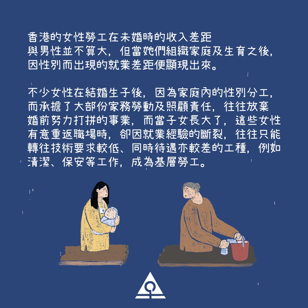 不少女性在結婚生子後,因為家庭內的性別分工,而承擔了大部份家務勞動及照顧責任,往往放棄婚前努力打拼的事業,而當子女長大了,這些女性有意重返職場時,卻因就業經驗的斷裂,往往只能轉往技術要求較低、同時待遇亦較差的工種,例如清潔、保安等工作,成為基層勞工。