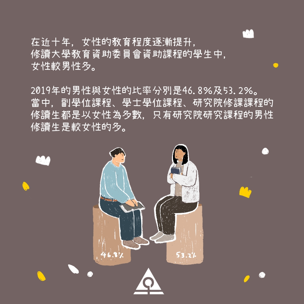 在近十年,女性的教育程度逐漸提升,修讀大學教育資助委員會資助課程的學生中,女性較男性多。
