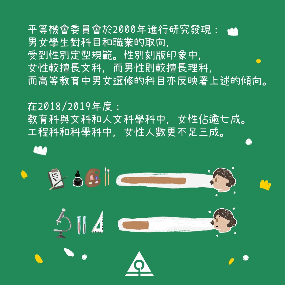 平等機會委員會於2000年進行的《學生對性別定型及家庭崗位的態度》的研究發現:男女學生對科目和職業的取向,受到性別定型規範。性別刻版印象中,女性較擅長文科,而男性則較擅長理科,而高等教育中男女選修的科目亦反映著上述的傾向。