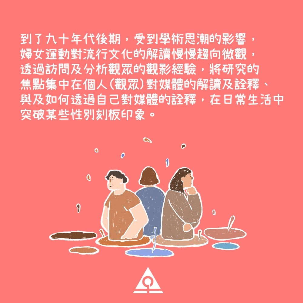 到了九十年代後期,受到學術思潮的影響,婦女運動對流行文化的解讀慢慢趨向微觀,透過訪問及分析觀眾的觀影經驗,將研究的焦點集中在個人(觀眾)對媒體的解讀及詮釋、與及如何透過自己對媒體的詮釋,在日常生活中突破某些性別刻板印象。