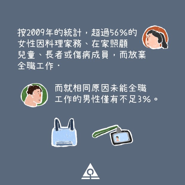 按2009年的統計,超過56%的女性,因料理家務、在家照顧兒童、長者或傷病成員,而放棄全職工作,而就相同原因未能全職工作的男性僅有不足3%。