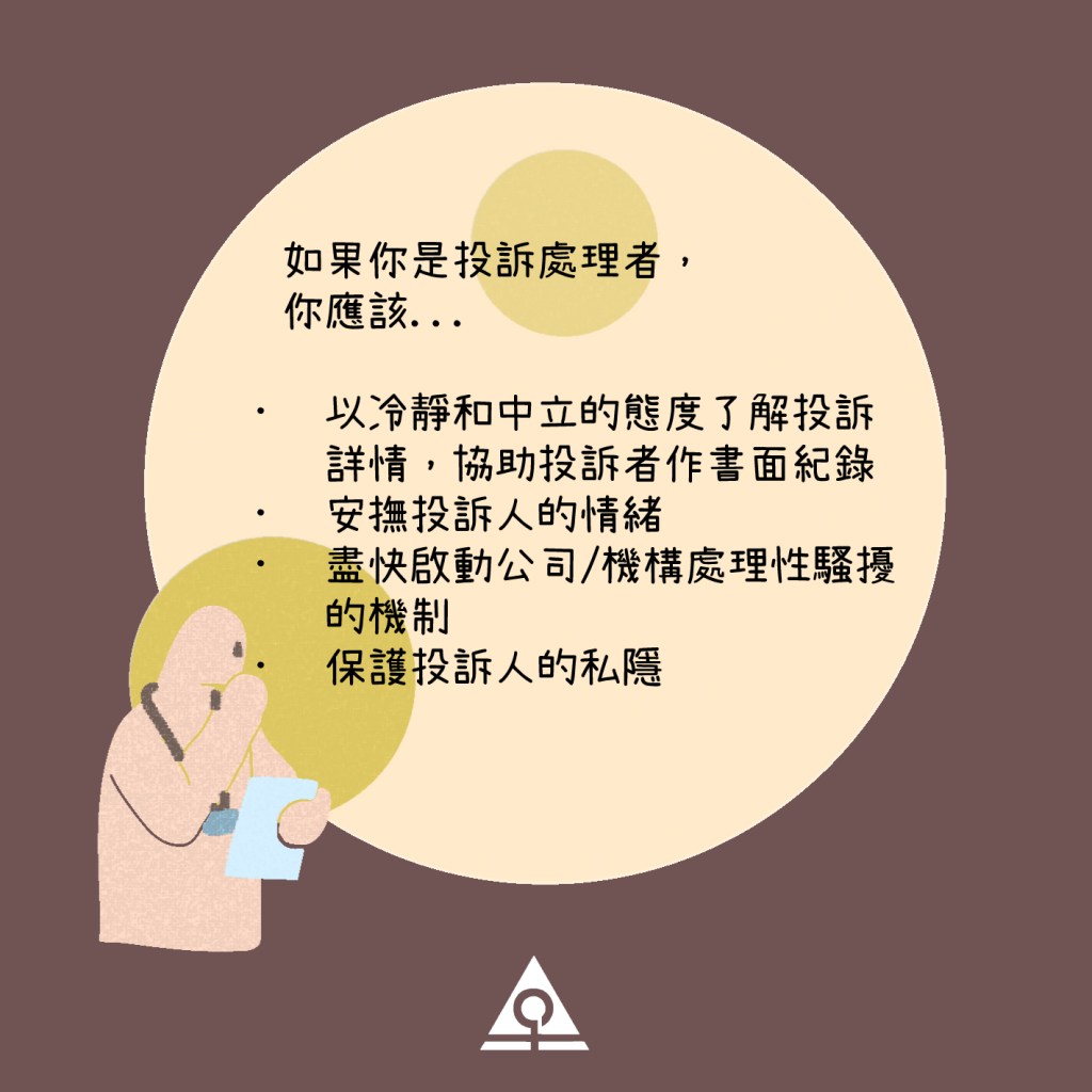 - 以冷靜和中立的態度了解投訴詳情,協助投訴者作書面紀錄