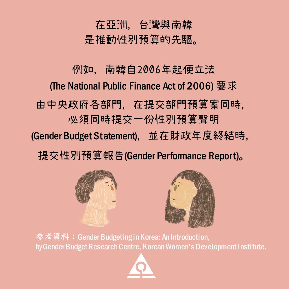 參考資料︰Gender Budgeting in Korea: An Introduction, by Gender Budget Research Centre, Korean Women’s Development Institute. (link)
