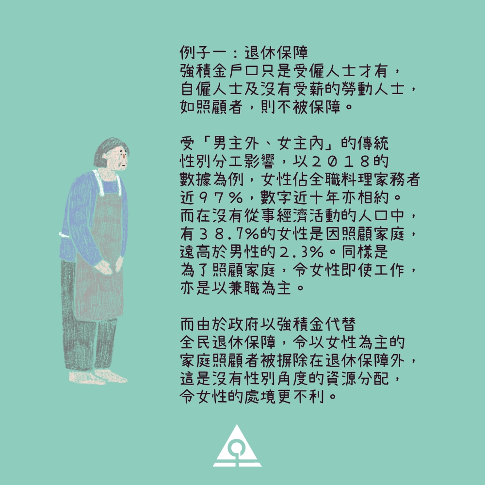而由於政府以強積金代替全民退休保障,令以女性為主的家庭照顧者被摒除在退休保障外,這是沒有性別角度的資源分配,令女性的處境更不利。