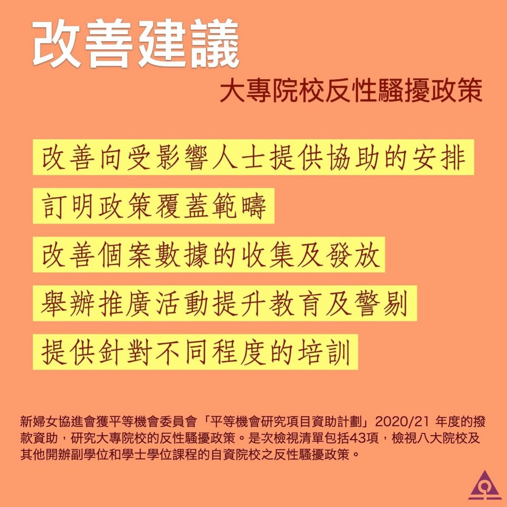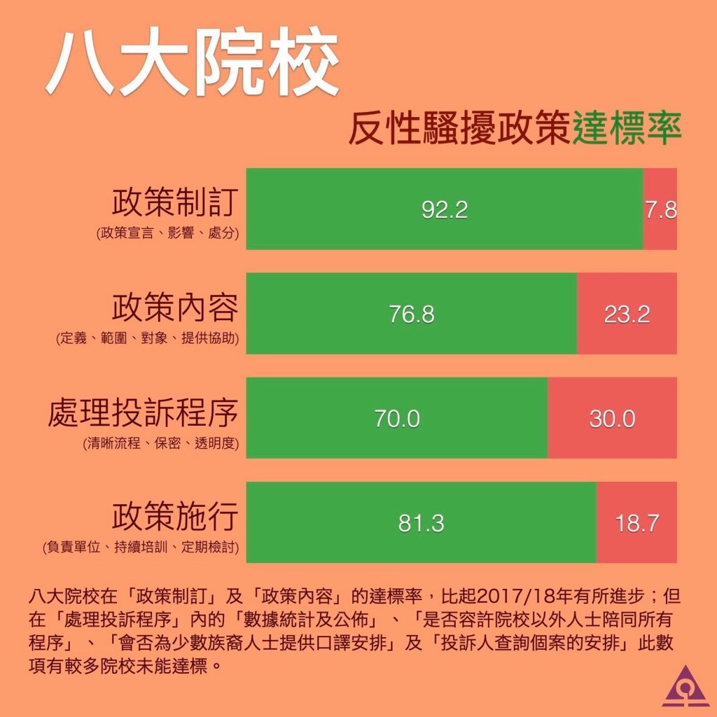 新婦女協進會(婦進)今天(2022年5月24日(星期二))公布 「大專院校反性騷擾政策檢視清單(2020/21)研究報告」結果。八大院校整體達標率平均值為78.2%;與2017/18年的調查79.2%相比輕微下降;自資院校回應率上升,整體達標率亦由2017/18年度的49.2%上升至54%。