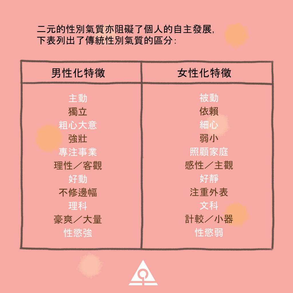 二元的性別氣質亦阻礙了個人的自主發展,下表列出了傳統性別氣質的區分: