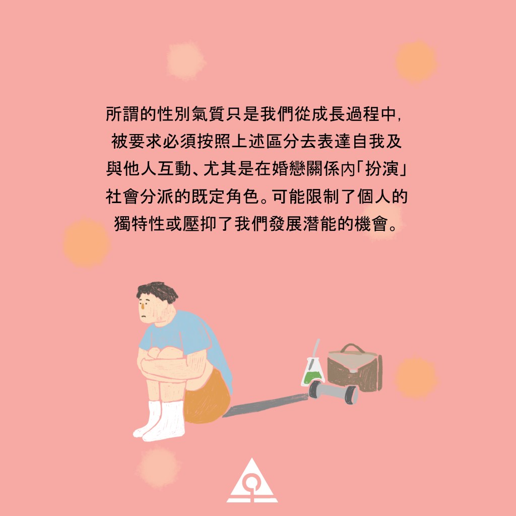 所謂的性別氣質只是我們從成長過程中,被要求必須按照上述區分去表達自我及與他人互動、尤其是在婚戀關係內「扮演」社會分派的既定角色。可能限制了個人的獨特性或壓抑了我們發展潛能的機會。