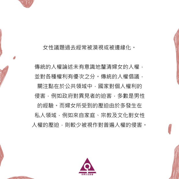 傳統的人權論述未有意識地釐清婦女的人權,並對各種權利有優次之分。傳統的人權倡議,關注點在於公共領域中,國家對個人權利的侵害,例如政府對異見者的迫害,多數是男性的經驗。而婦女所受到的壓迫由於多發生在私人領域,例如來自家庭、宗教及文化對女性人權的壓迫,則較少被視作對普遍人權的侵害。