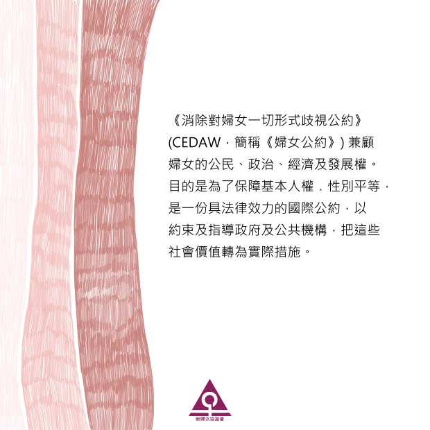 《消除對婦女一切形式歧視公約》 (CEDAW,簡稱《婦女公約》) 兼顧婦女的公民、政治、經濟及發展權。目的是為了保障基本人權﹑性別平等,是一份具法律效力的國際公約,以約束及指導政府及公共機構,把這些社會價值轉為實際措施。