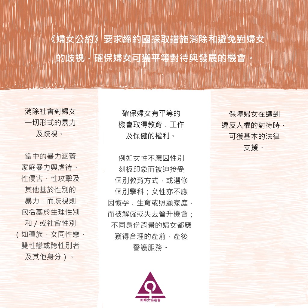 - 確保婦女有平等的機會取得教育﹑工作及保健的權利。例如女性不應因性別刻板印象而被迫接受個別教育方式,或選修個別學科;女性亦不應因懷孕﹑生育或照顧家庭,而被解僱或失去晉升機會;不同身份背景的婦女都應獲得合理的產前、產後醫護服務。