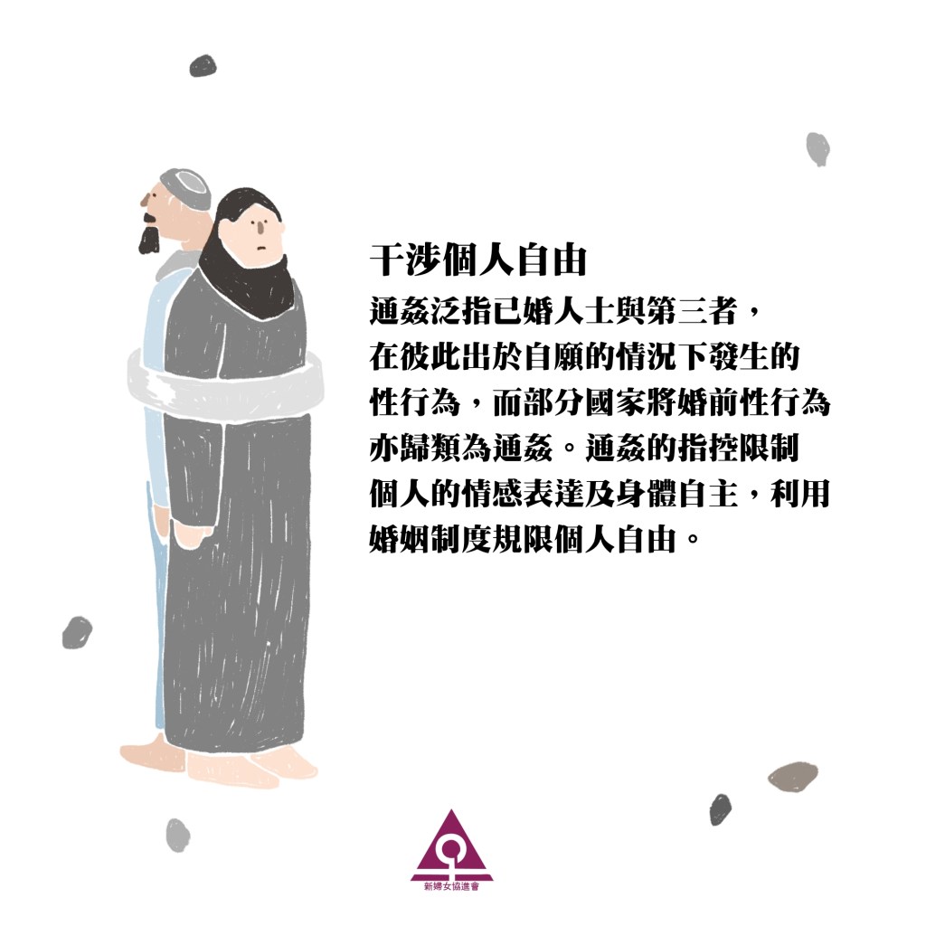 通姦泛指已婚人士與第三者,在彼此出於自願的情況下發生的性行為,而部分國家將婚前性行為亦歸類為通姦。通姦的指控限制個人的情感表達及身體自主,利用婚姻制度規限個人自由。