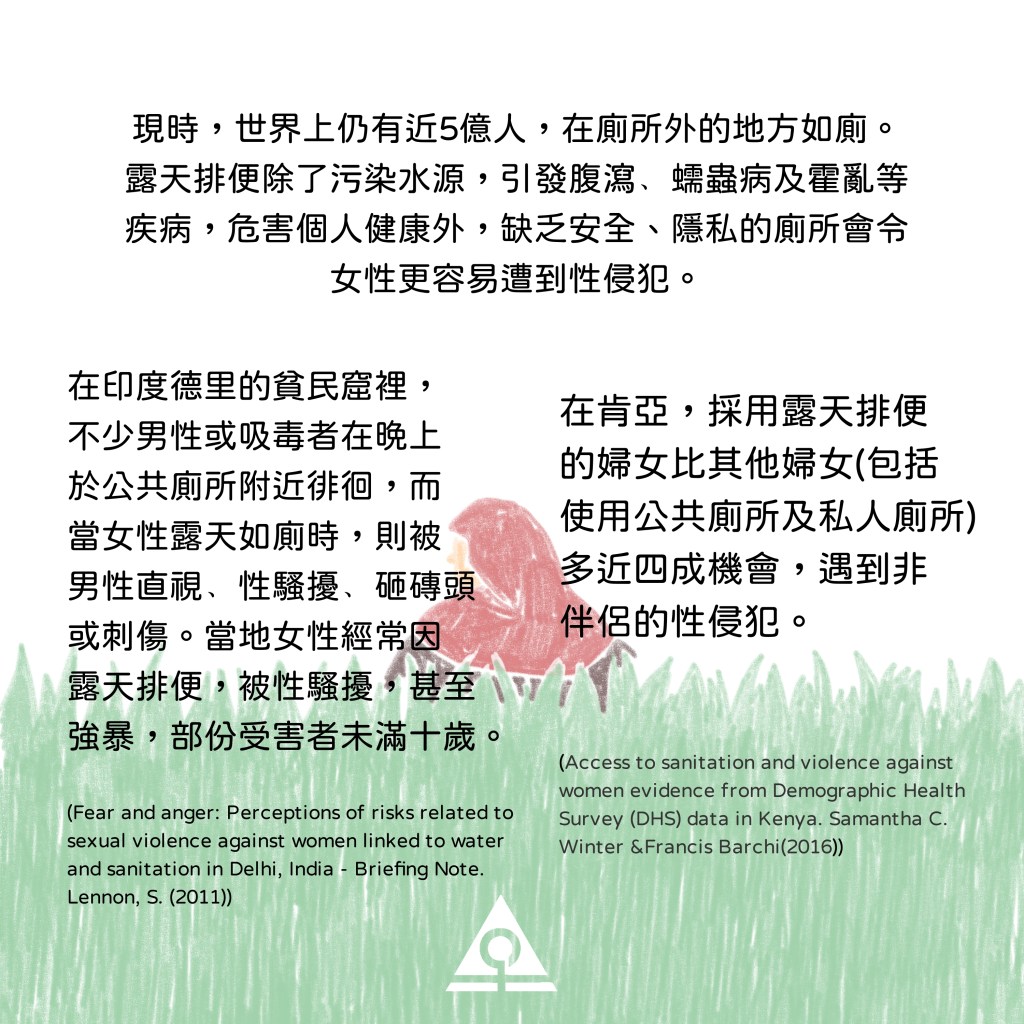 現時,世界上仍有近5億人,在廁所外的地方如廁。露天排便除了污染水源,引發腹瀉﹑蠕蟲病及霍亂等疾病,危害個人健康外,缺乏安全、隱私的廁所會令女性更容易遭到性侵犯。