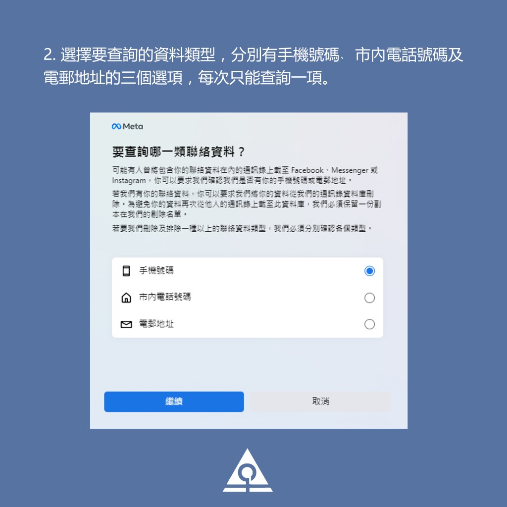 無論是Meta的用戶或非用戶,可使用「删除聯絡資料」的功能,要求自己的通訊資料,在通訊錄資料庫中删除,並防止資料再度被上傳。