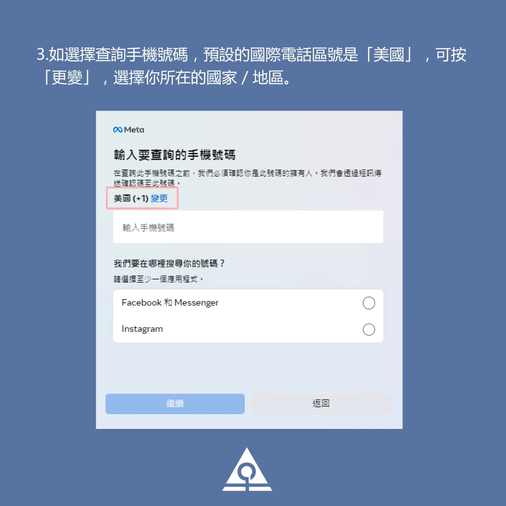 3.如選擇查詢手機號碼,預設的國際電話區號是「美國」,可按「更變」,選擇你所在的國家/地區。