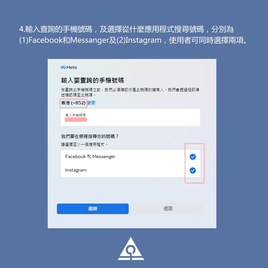 4.輸入查詢的手機號碼,及選擇從什麼應用程式搜尋號碼,分別為(1)Facebook和Messanger 及(2)Instagram,使用者可同時選擇兩項。