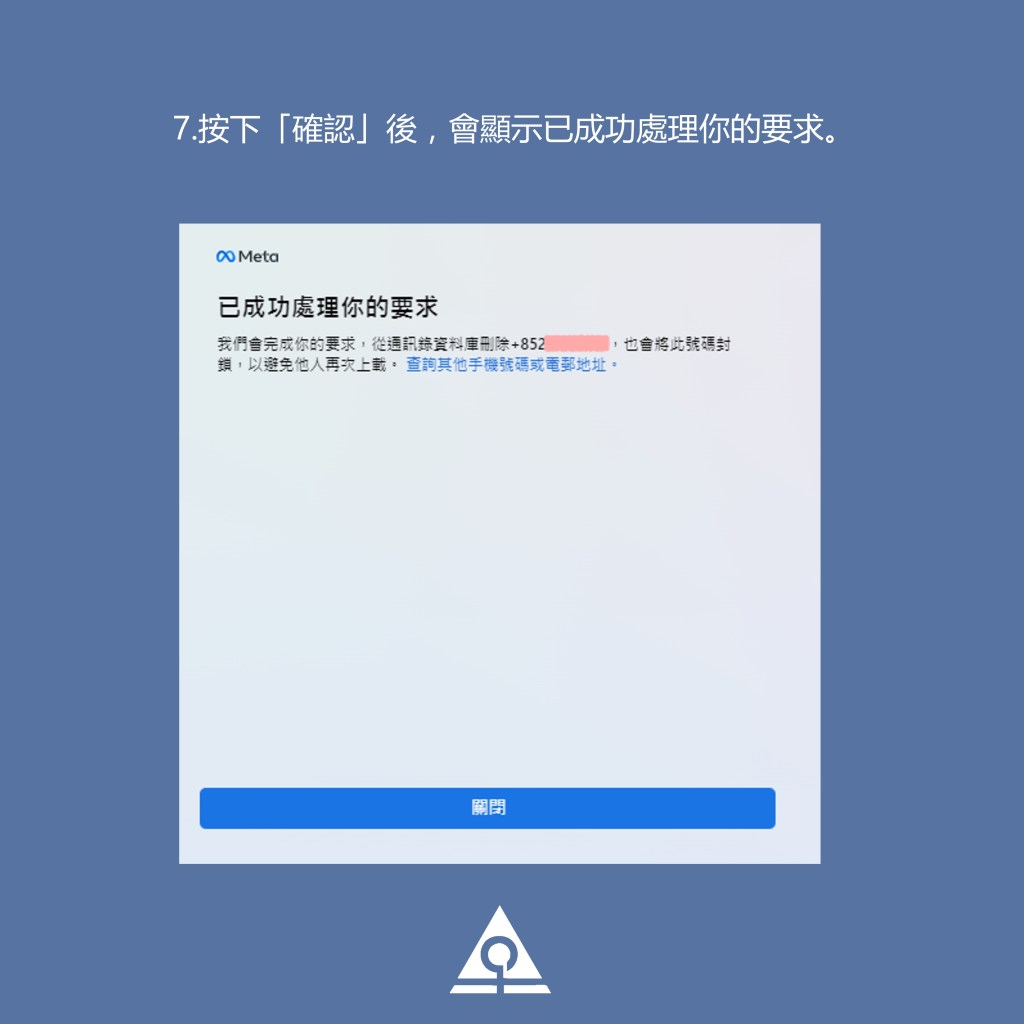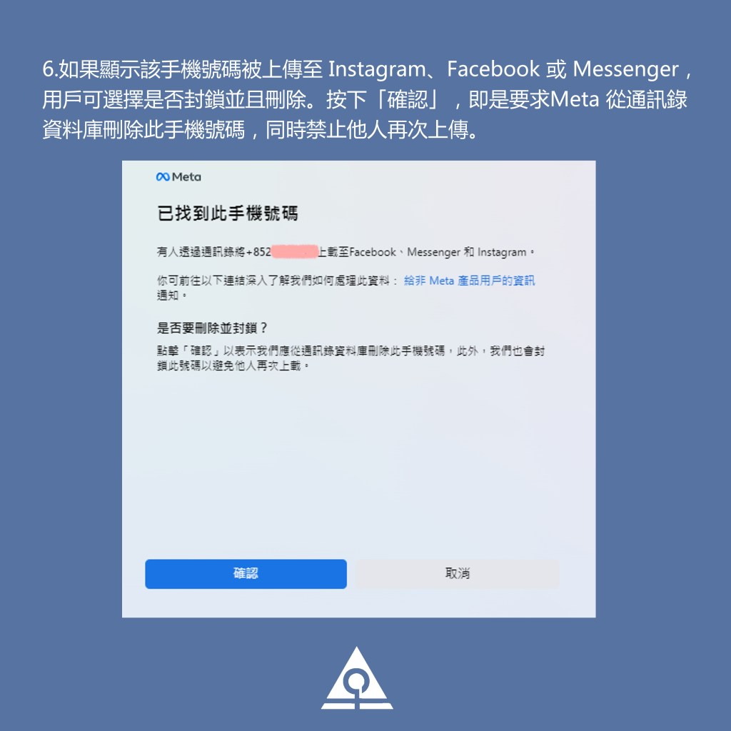 6.如果顯示該手機號碼被上傳至 Instagram、Facebook 或 Messenger,用戶可選擇是否封鎖並且刪除。按下「確認」,即是要求Meta 從通訊錄資料庫刪除此手機號碼,同時禁止他人再次上傳。