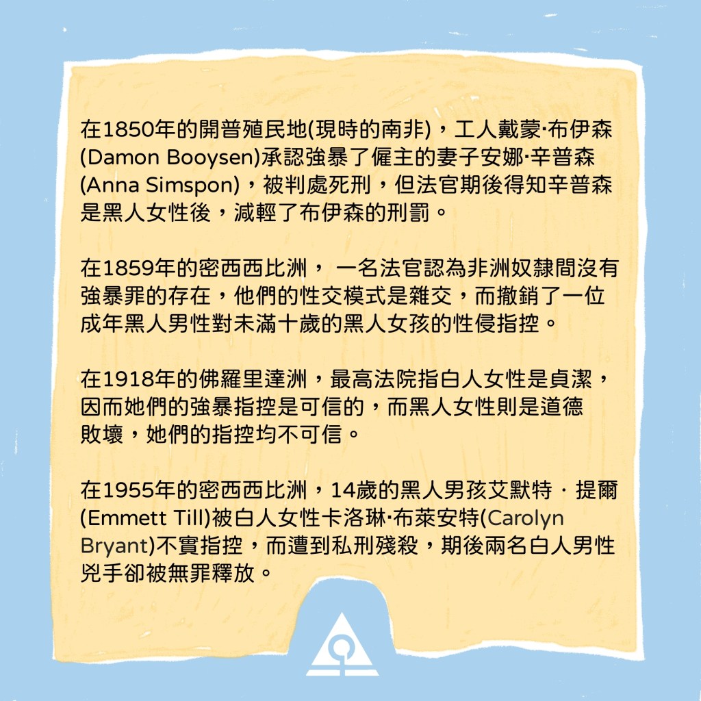 在1918年的佛羅里達洲,最高法院指白人女性是貞潔,因而她們的強暴指控是可信的,而黑人女性則是道德敗壞,她們的指控均不可信。