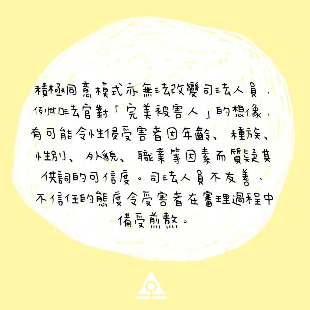 積極同意模式亦無法改變司法人員,例如法官對「完美被害人」的想像,有可能令性侵受害者因年齡﹑種族﹑性別﹑外貌﹑職業等因素而質疑其供詞的可信度。司法人員不友善、不信任的態度令受害者在審理過程中備受煎熬。