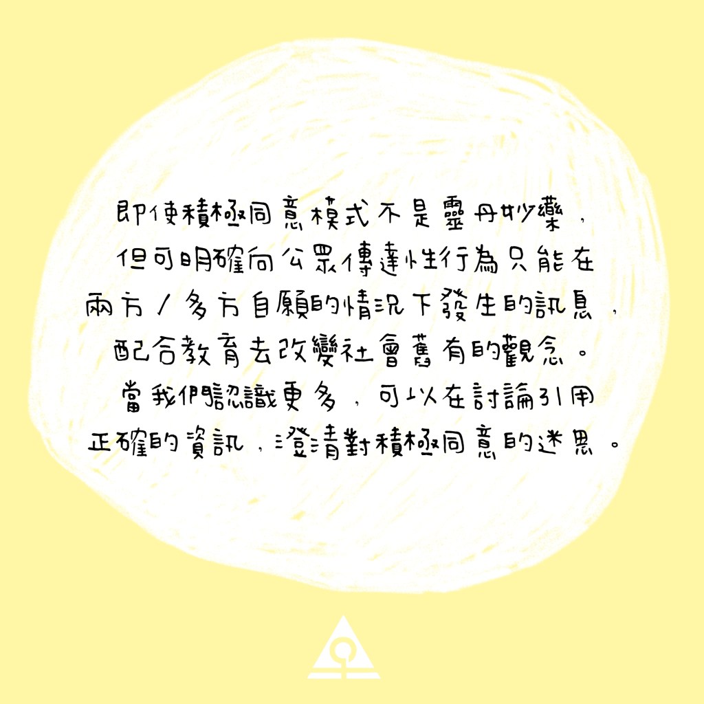 即使積極同意模式不是靈丹妙藥,但可明確向公眾傳達性行為只能在兩方/多方自願的情況下發生的訊息,配合教育去改變社會舊有的觀念。當我們認識更多,可以在討論引用正確的資訊,釐清對積極同意的迷思。