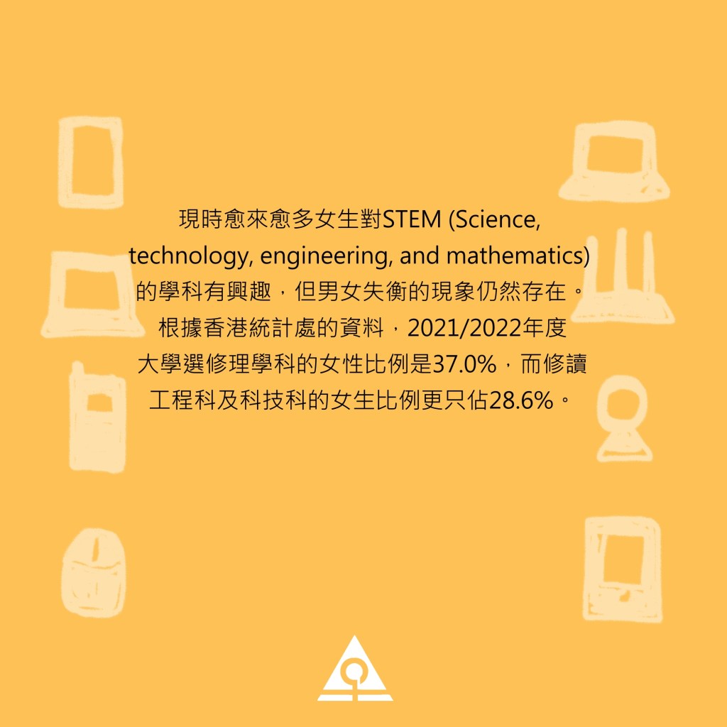 現時愈來愈多女生對STEM (Science, technology, engineering, and mathematics) 的學科有興趣,但男女失衡的現象仍然存在。根據香港統計處的資料,2021/2022年度大學選修理學科的女性比例是37.0%,而修讀工程科及科技科的女生比例更只佔28.6%。