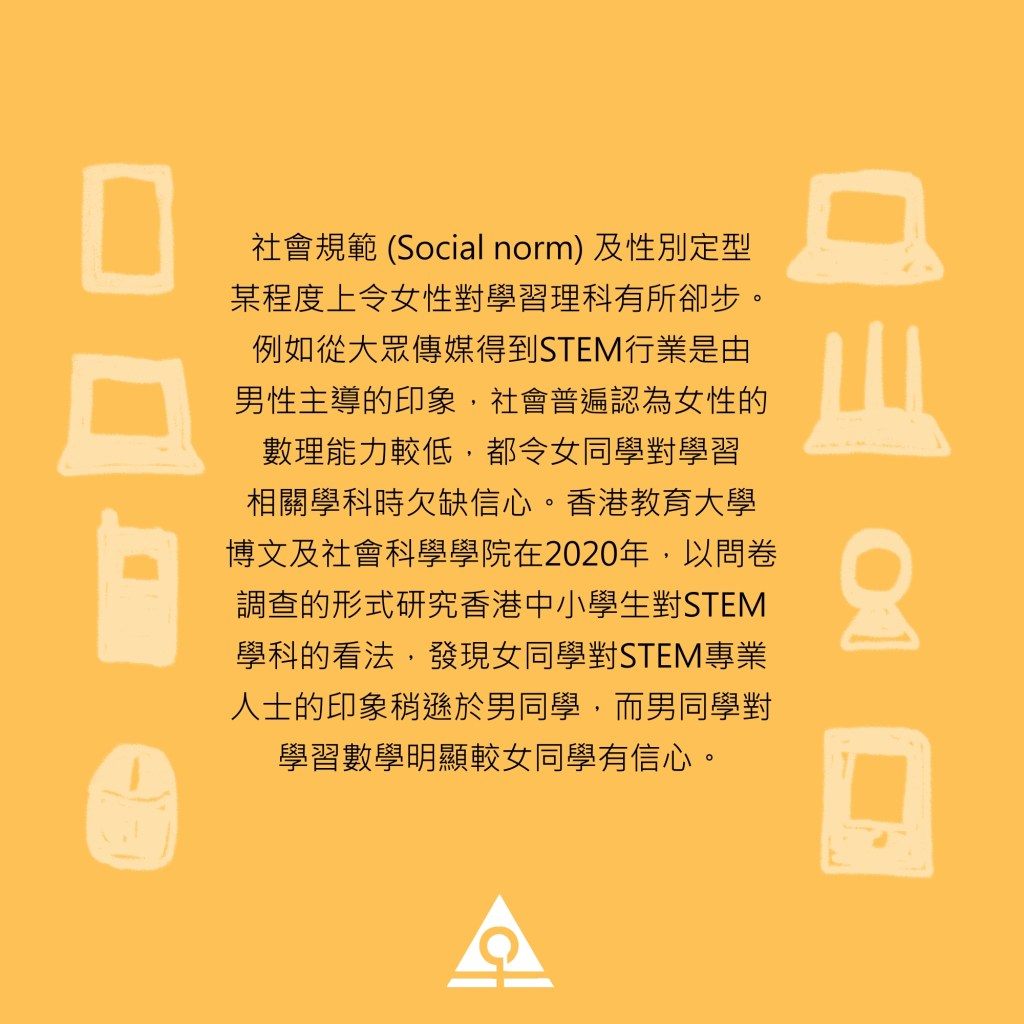 社會規範 (Social norm) 及性別定型某程度上令女性對學習理科有所卻步。例如從大眾傳媒得到STEM行業是由男性主導的印象,社會普遍認為女性的數理能力較低,都令女同學對學習相關學科時欠缺信心。香港教育大學博文及社會科學學院在2020年,以問卷調查的形式研究香港中小學生對STEM學科的看法,發現女同學對STEM專業人士的印象稍遜於男同學,而男同學對學習數學明顯較女同學有信心。
