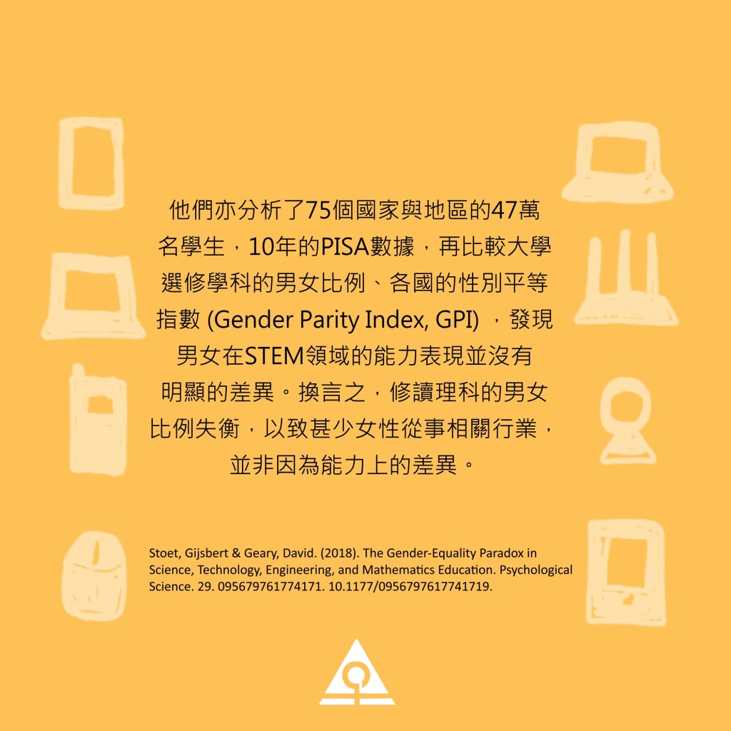 他們亦分析了75個國家與地區的47萬名學生,10年的PISA數據,再比較大學選修學科的男女比例、各國的性別平等指數 (Gender Parity Index, GPI) ,發現男女在STEM領域的能力表現並沒有明顯的差異。換言之,修讀理科的男女比例失衡,以致甚少女性從事相關行業,並非因為能力上的差異。