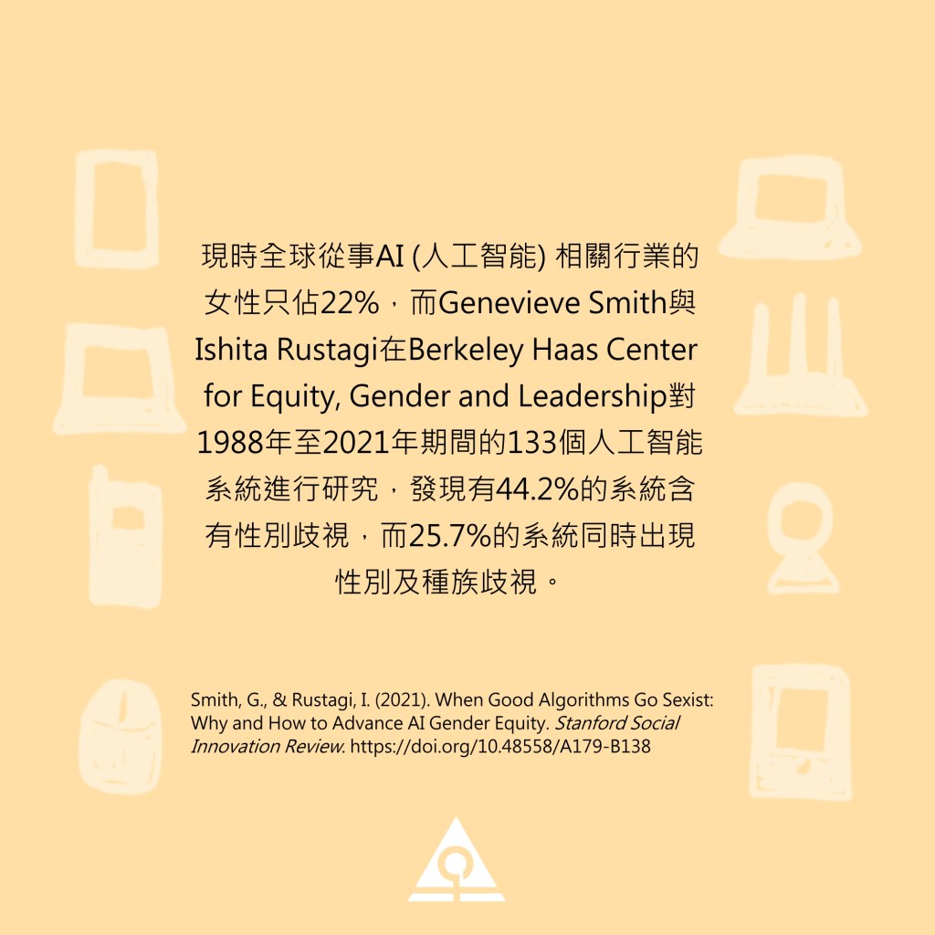 現時全球從事AI (人工智能) 相關行業的女性只佔22%,而Genevieve Smith與Ishita Rustagi在Berkeley Haas Center for Equity, Gender and Leadership對1988年至2021年期間的133個人工智能系統進行研究,發現有44.2%的系統含有性別歧視,而25.7%的系統同時出現性別及種族歧視。