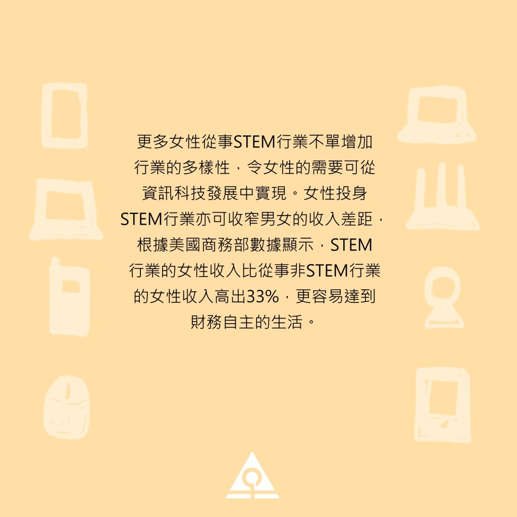 更多女性從事STEM行業不單增加行業的多樣性,令女性的需要可從資訊科技發展中實現。女性投身STEM行業亦可收窄男女的收入差距,根據美國商務部數據顯示,STEM行業的女性收入比從事非STEM行業的女性收入高出33%,更容易達到財務自主的生活。