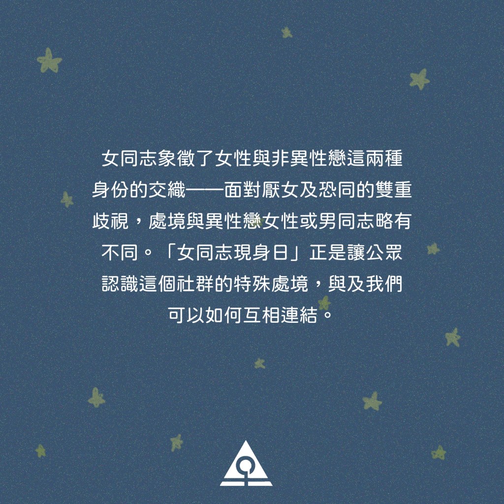 女同志象徵了女性與非異性戀這兩種身份的交織——面對厭女及恐同的雙重歧視,處境與異性戀女性或男同志略有不同。「女同志現身日」正是讓公眾認識這個社群的特殊處境,與及我們可以如何互相連結。