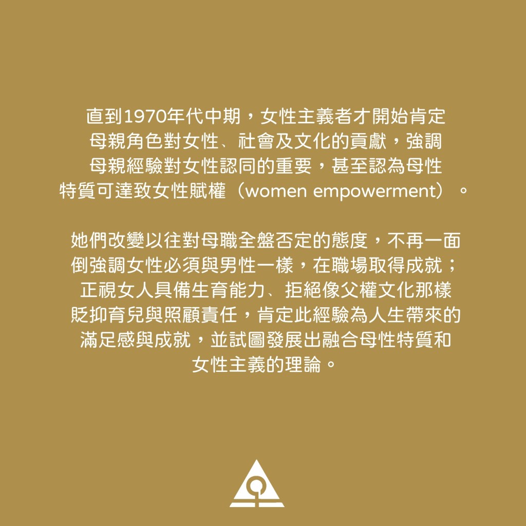 直到1970年代中期,女性主義者才開始肯定母親角色對女性﹑社會及文化的貢獻,強調母親經驗對女性認同的重要,甚至認為母性特質可達致女性賦權(women empowerment)。她們改變以往對母職全盤否定的態度,不再一面倒強調女性必須與男性一樣,在職場取得成就;正視女人具備生育能力﹑拒絕像父權文化那樣貶抑育兒與照顧責任,肯定此經驗為人生帶來的滿足感與成就,並試圖發展出融合母性特質和女性主義的理論。