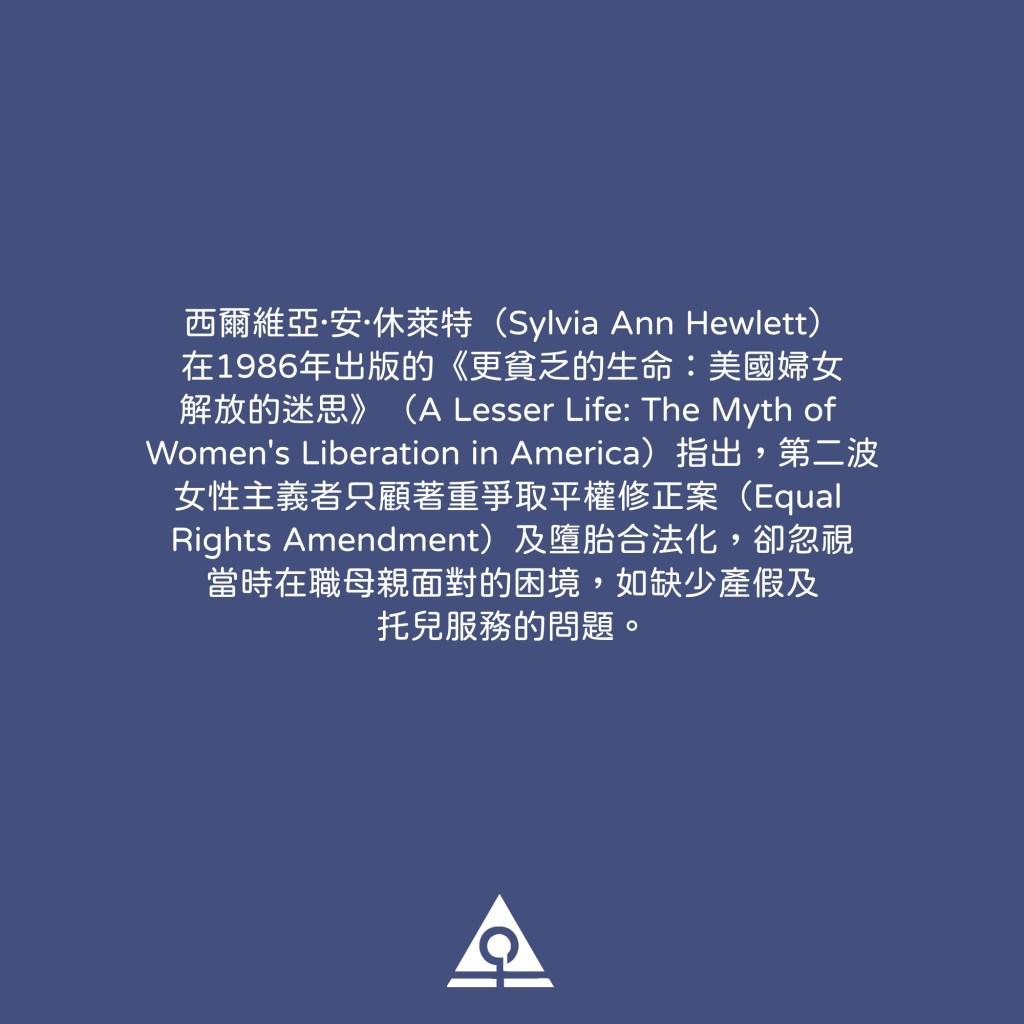 西爾維亞·安·休萊特(Sylvia Ann Hewlett)在1986年出版的《更貧乏的生命:美國婦女解放的迷思》(A Lesser Life: The Myth of Women’s Liberation in America)指出,第二波女性主義者只顧著重爭取平權修正案(Equal Rights Amendment)及墮胎合法化,卻忽視當時在職母親面對的困境,如缺少產假及托兒服務的問題。