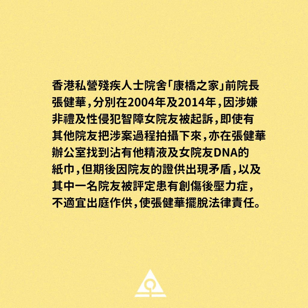 香港私營殘疾人士院舍「康橋之家」前院長張健華,分別在2004年及2014年,因涉嫌非禮及性侵犯智障女院友被起訴,即使有其他院友把涉案過程拍攝下來,亦在張健華辦公室找到沾有他精液及女院友DNA的紙巾,但期後因院友的證供出現矛盾,以及其中一名院友被評定患有創傷後壓力症,不適宜出庭作供,使張健華擺脫法律責任。